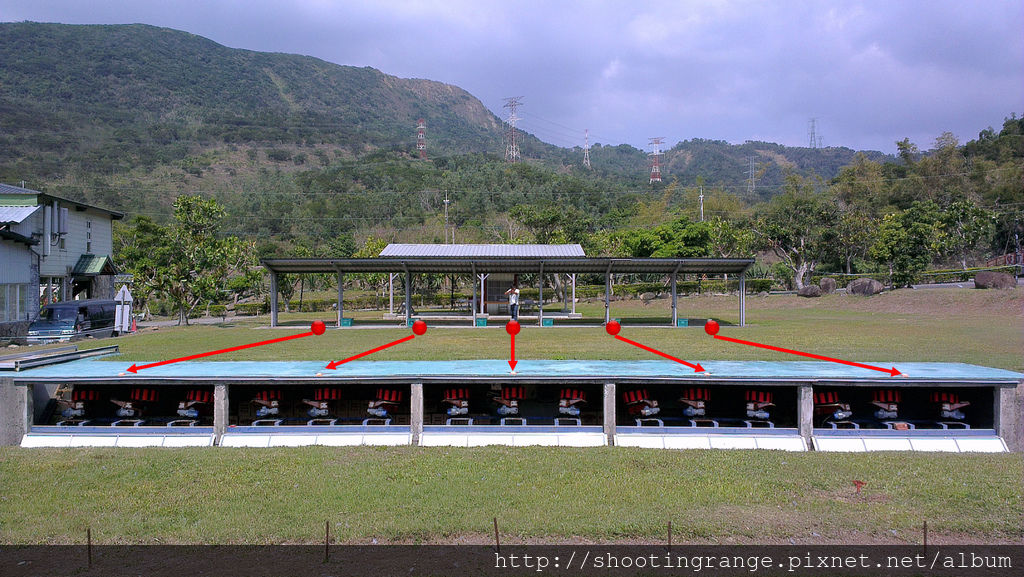 好久沒來個小常識了~~~今天讓大家看一下不定向飛靶區的廬山真面目,因為一般人是無法直接進入射擊區域拍到不定向飛靶區的正面,今天由靶場的專業教練幫大家拍下它的真相讓大家瞧瞧囉!!!圖片中5個紅點為射手所站立的靶位,每個靶位正前方則對應3台靶機,分別控制左向右向和直向飛靶,可是會飛哪個出來讓你射擊,就不知道囉!!!